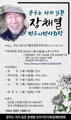 [순천/시사호남] 조용호 기자 = 전남 동부권 시민사회운동의 중심에서 평생을 풀뿌리 민주주의와 자치운동에 헌신해온 전남동부지역사회연구소 장채열 이사장이 9일 오후 지병으로 별세했다. 향년 62세.전남진보연대와 순천시민사회단체들은 곧 ‘꿈꾸는 자치일꾼 장채열 민주시민사회장례위원회’를 꾸리고 장례를 시민사회장 형태로 진행할 예정이라고 밝혔다.1963년 전남 고흥에서 태어난 장 이사장은 1980년 전남고 재학 중 5·18 광주민주화운동을 직접 목격하며 민주화운동에 투신했다.1981년 전남대학교 입학 후 학생운동과 학내 문화운동을 이끌었고