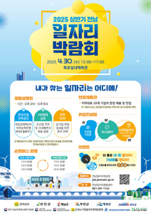 [광주광역시/시사호남] 광주전남지방중소벤처기업청(청장 직무대리 이순석)은 전라남도, 목포고용노동지청, 광주지방보훈청 등과 함께 전남 지역 구직자들의 취업 기회를 확대하기 위해 오는 30일(수) 오후 1시부터 목포실내체육관에서 ‘2025 상반기 전남 일자리박람회’를 개최한다고 23일 밝혔다.이번 박람회에는 조선업, 식품제조업, 화학, 관광숙박 등 다양한 분야의 전남 지역 우수 중소기업 28개사가 참여하며, 총 150여 명 채용을 목표로 한다. 일반 구직자뿐 아니라 대학생, 특성화고 학생 등 취업을 희망하는 누구나 현장에서 이력서를 제